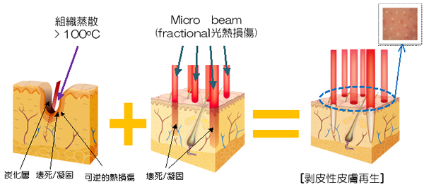 フラクショナルレーザーとは、eCO2やフラクセルⅡに代表される、「水分を含んだものに反応する」という性質が強いため、皮膚垂直方向の深層まで作用し、皮膚を入れ替えるレーザー治療です。